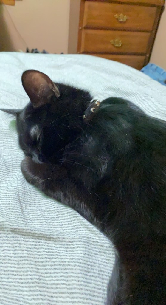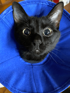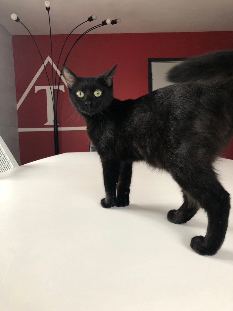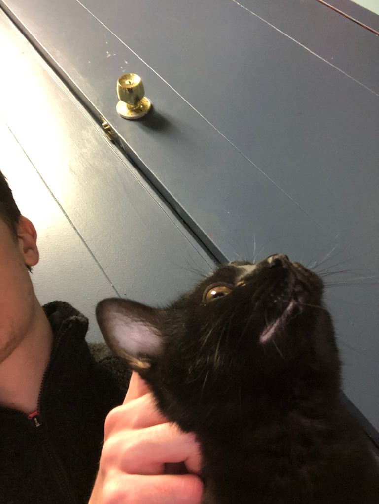 a stray black cat rescued by the Kansas Chapter of Triangle Fraternity. I now live somewhere else with 5 amazing roommates and so many windows to look out of. My hobbies include posing for pictures, playing with loose hair ties, and recharging underneath my favorite sunbeam in the living room.